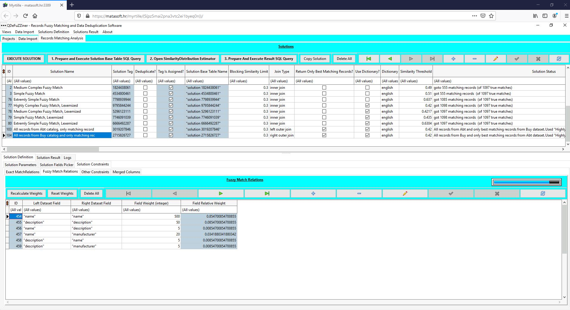 Under Solution Constraints /Fuzzy Match Relations, there are multiple field pairs combinations defined, with different weights assigned. Besides main columns being paired, additional potentially useful combinations of column pairs are also included. Such additional combinations sometimes improve fuzzy matching, but in many cases is contra-productive.
