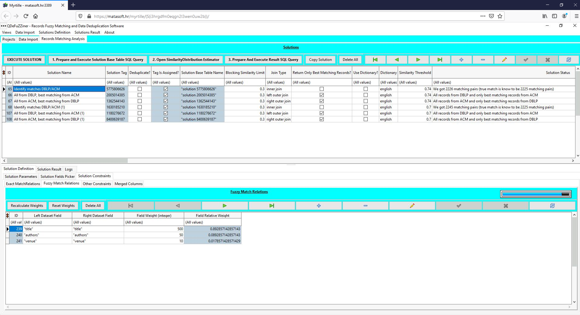 Under Solution Constraints check how we defined both fuzzy matching constraints (on "titles", "venue" and "authors") and exact matching constraint on "year" field. Whenever you can define an exact constraint on a fields pair, definitely do it - in most cases it will dramatically improve accuracy and speed of execution.